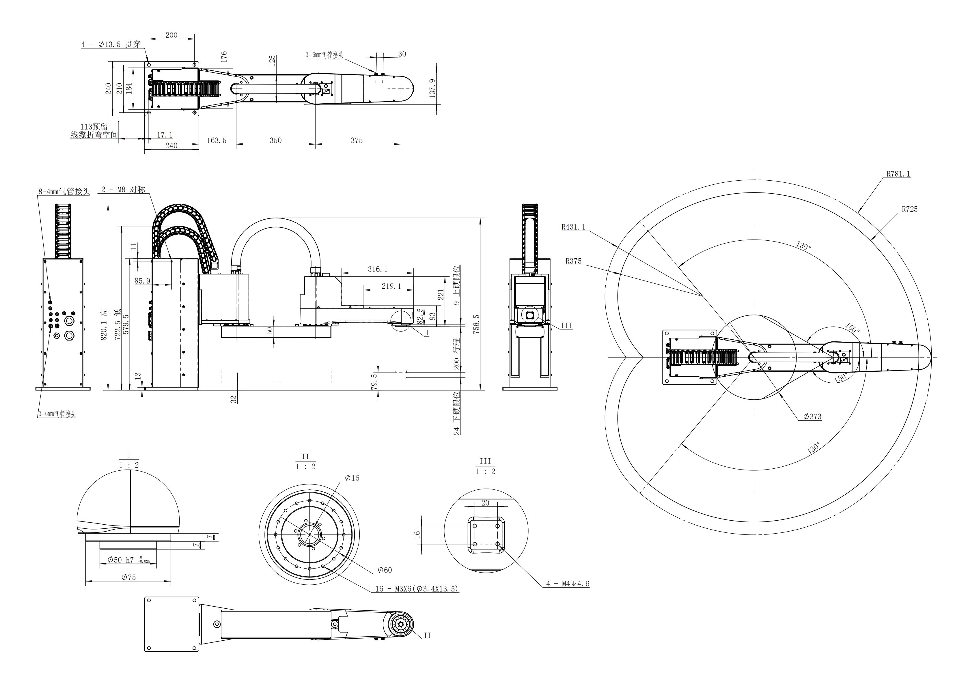 J1軸旋轉0-200mm J2軸旋轉±130° J3軸移動±150° J4軸旋轉±360°